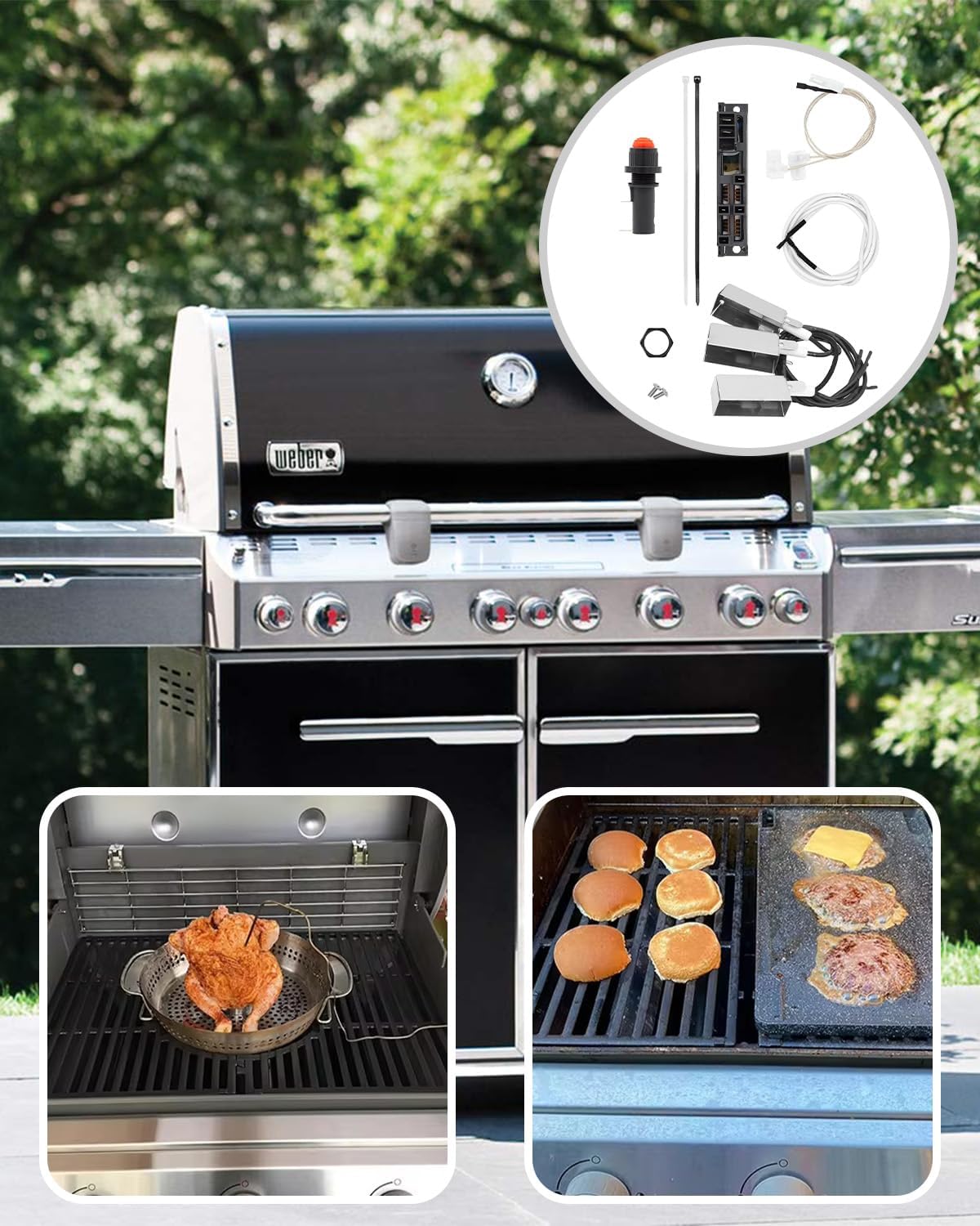 Compatibility: Fit for Weber Gold/Platinum B6 - 6 burner gas grill models, including: 5270001/5270009/5370001/5370009/5770001/5770009/5870001/7770009 Fit for Weber Summit Gold B Fit for Weber Summit Gold B6 Fit for Weber Summit Platinum B6 Replacement Part Number: 42325 The kit includes all necessary components for installation: 1* Red Push Button Ignition Switch 3* Ceramic Electrodes with Collector Box. 1* Electronic Igniter. 1* Wire with Terminals. 1* Connecting Wires and Mounting Screws. The kit does not include components for the side/auxiliary burner Features: Function:Designed for efficient ignition of your gas grill, ensuring a quick and reliable start every time. High-Quality Plastic:Durability: The plastic components are made from high-strength, heat-resistant plastic that can withstand the intense temperatures encountered during grilling. This ensures the igniter maintains its structural integrity over prolonged use. Robust Metal:Corrosion Resistance: The metal parts, including the electrodes and screws, are crafted from corrosion-resistant alloys. This prevents rust, particularly important for outdoor equipment exposed to various weather conditions High-Performance Ceramic:Insulation: Ceramic electrodes are chosen for their excellent insulating properties. They can handle high temperatures without conducting heat to other parts, preventing potential overheating. Easy Installation:Designed for direct installation with no special tools required. This user-friendly feature allows for a hassle-free replacement process, getting your grill back in action quickly. Attention: Always check your grill model for compatibility before purchase to ensure proper fit and function. LEGAL DISCLAIMER: The brand name & model # (if listed) are for cross reference. All brands, trademarks and model numbers remain the property of their respective owners.)